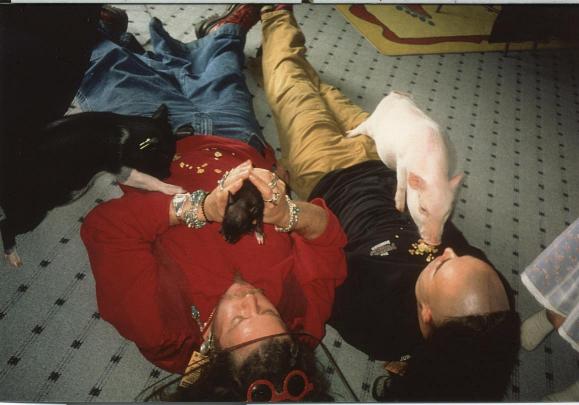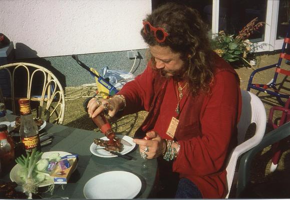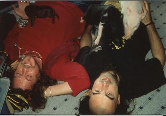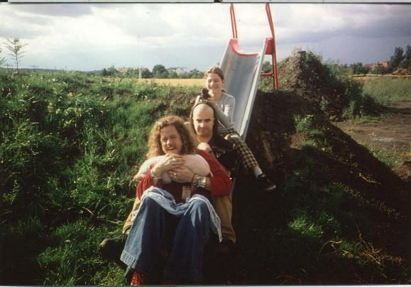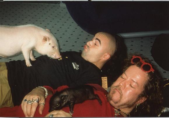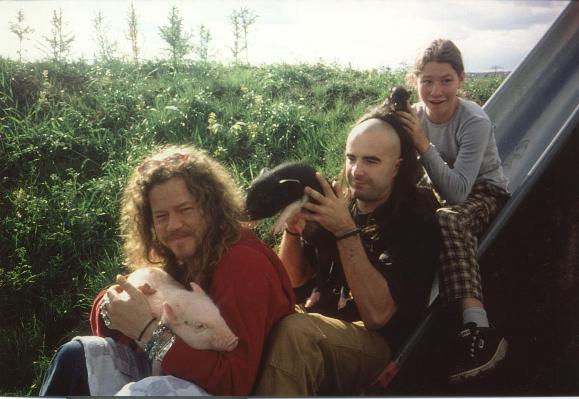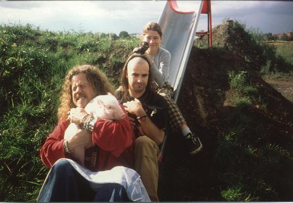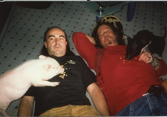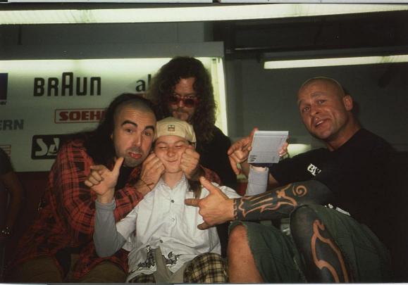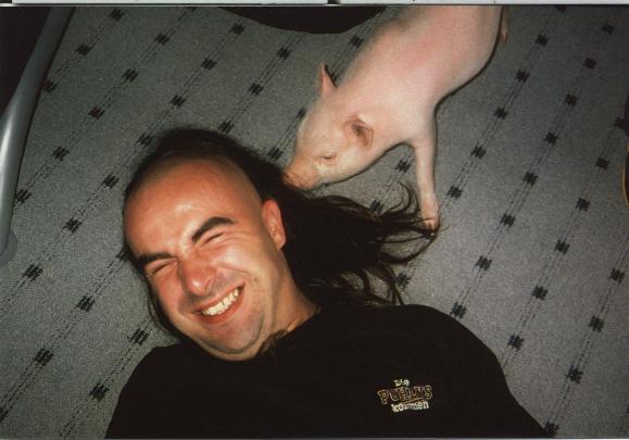 Natürlich habe ich damit die knorkators herausgefordert und neugierig gemacht. Da sie unbedingt ein autogramm loswerden wollten und auch sonst für jeden spass zu haben sind, willigten sie ein und ich sollte ihnen zeigen wie das mit dem schweinwerden so ist. Mit stumpen und dem Drummer habe ich also angefangen. |