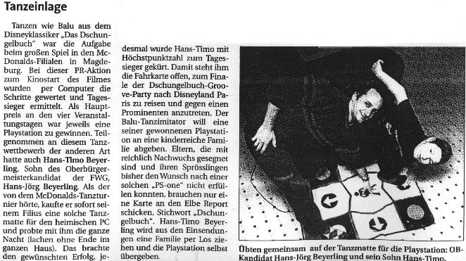 Tage später...Timo hat 33800 Punkte. Nach meinen Beobachtungen hätte ich das Spiel auf maximal 28000 Punkte geschätzt. Wir warten nun alle auf Nachricht und evt. auf Disneyland. Neulich ist uns eine McDoof Reklame aufgefallen. Der Sieger der Endausscheidung wird im Disneychannel gegen einen Prominenten antreten. Sollte das der derzeitige Werbeträger sein? Wenigstens zu 30% rechnent sich Timo die Chance aus: Endlich Raab. Unser “Kleines rosanes Neue” haben wir schon “Konrad” getauft. Wir berichten demnächst.... 19.01.2001 Timo im OKM bei “Offen&Live”. Als “Kopfsalat”-Gewinner war er als Pate vor der Kamera. Mit dabei am 19.01. - Hierschbiet - voll krass. Superwind 2000 der Sommerhit 01 !!! |